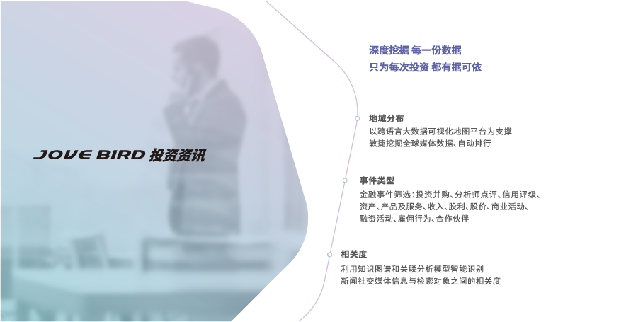 JoveBird是以专业金融分析模型和领先跨语言大数据技术为基础的另类数据分析平台,可利用基本面分析、情感分析及关联聚类等一系列独有金融分析算法对全球另类数据,以及纳斯达克、纽约、伦敦、港、沪、深市等全球十大股市的30000家上市企业动态进行智能分析,辅助投研机构、信用评级机构、金融监管机构等制定投资决策、辅助信用评级以及加强行业监管。
